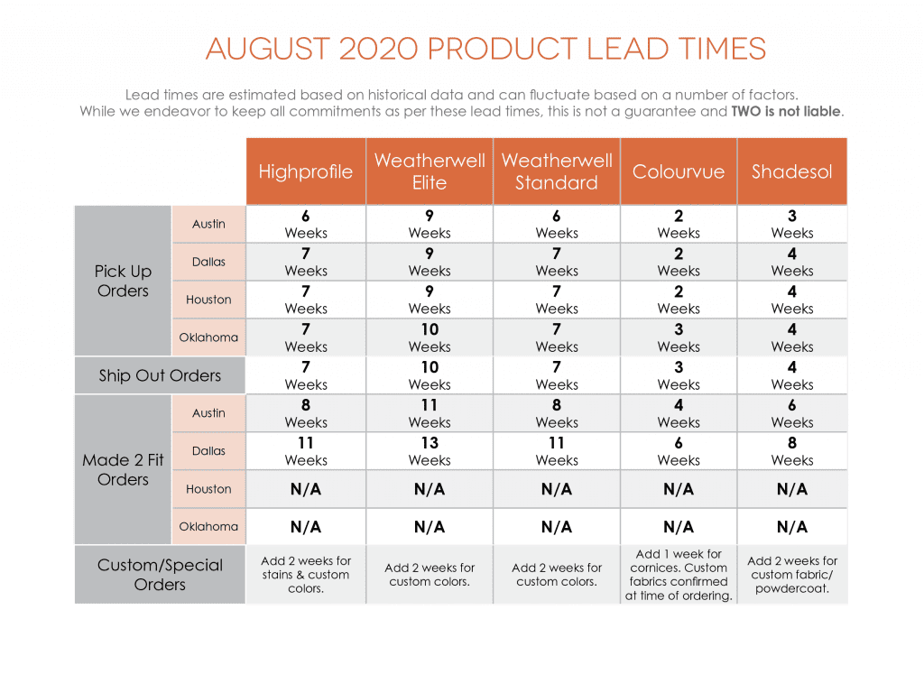 Please see below for the August 2020 Lead Times. If you have any questions, please reach out to your local sales rep.